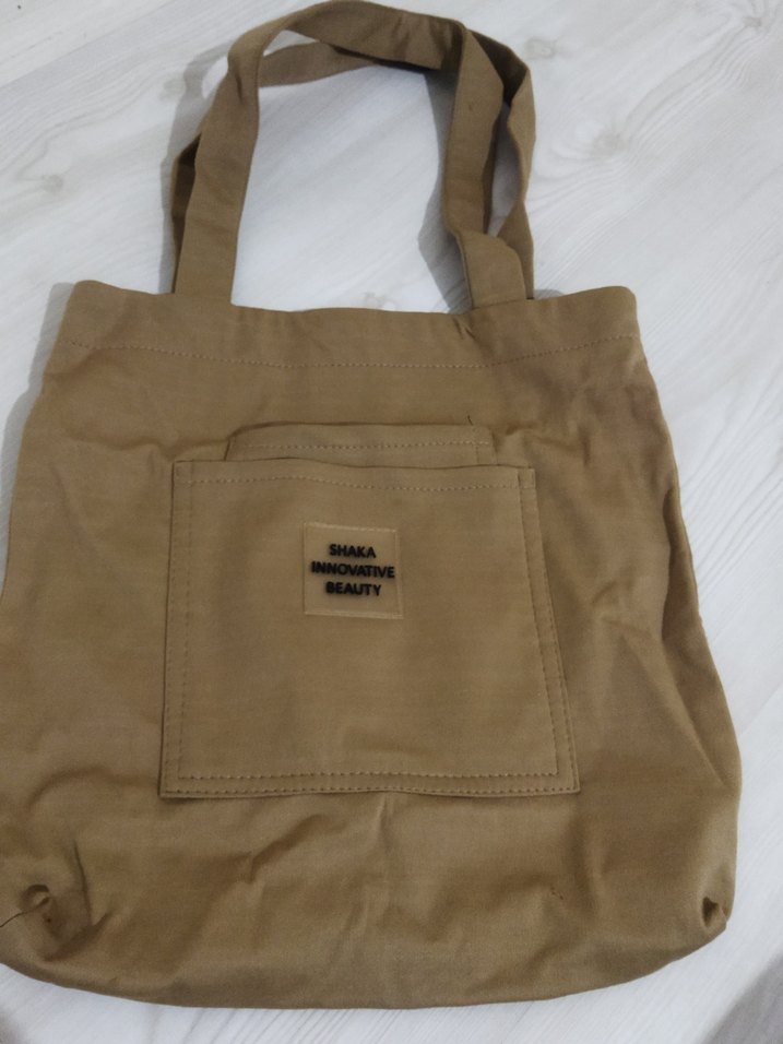 Ön cepli, baskılı etiketli bej süet kadın çantası. Minimalist sokak tarzı ve zahmetsiz şıklık sunar.