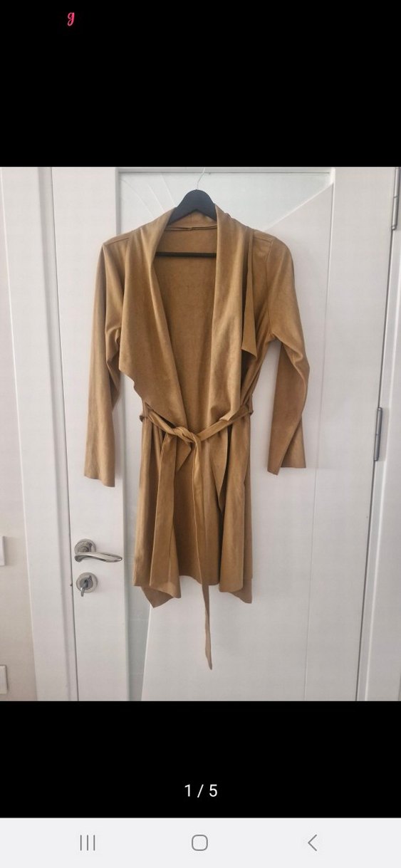 Bej süet kumaştan kemerli, notalı yakalı kadın kaban. Uzun kollu, bol kesim ve midi boyda, günlük rahat sokak stili için uygundur.