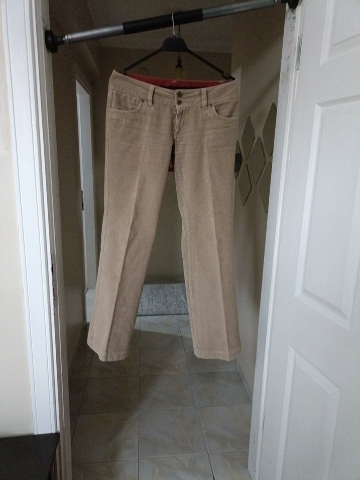 Bej renkte, süet kumaştan, kemerli ve normal boyda kadın pantolonu. Günlük rahat kullanıma uygundur.