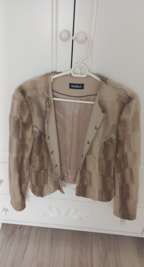 Bej renkte, süet kumaştan yapılmış, kürk detaylı kadın ceket. Normal kesim, uzun kollu ve midi boyda, ofis için uygundur. Desensiz, normcore tarzına uygun.