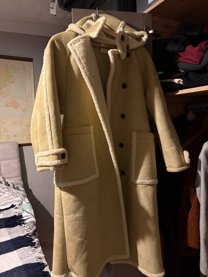 Bej renkli, süet kumaştan yapılmış, kürklü detaylara sahip, rahat kesim ve notalı yakalı kadın kabanı. Uzun kollu ve midi boydadır.