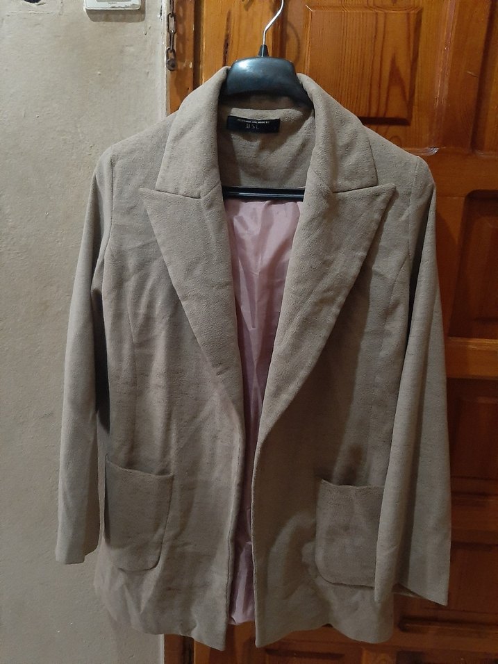 Bej süet midi blazer, kesik yaka ve düğmeli ön detaylıdır. Uzun kollu, normal kesim ve ofis ile günlük kullanıma uygundur.