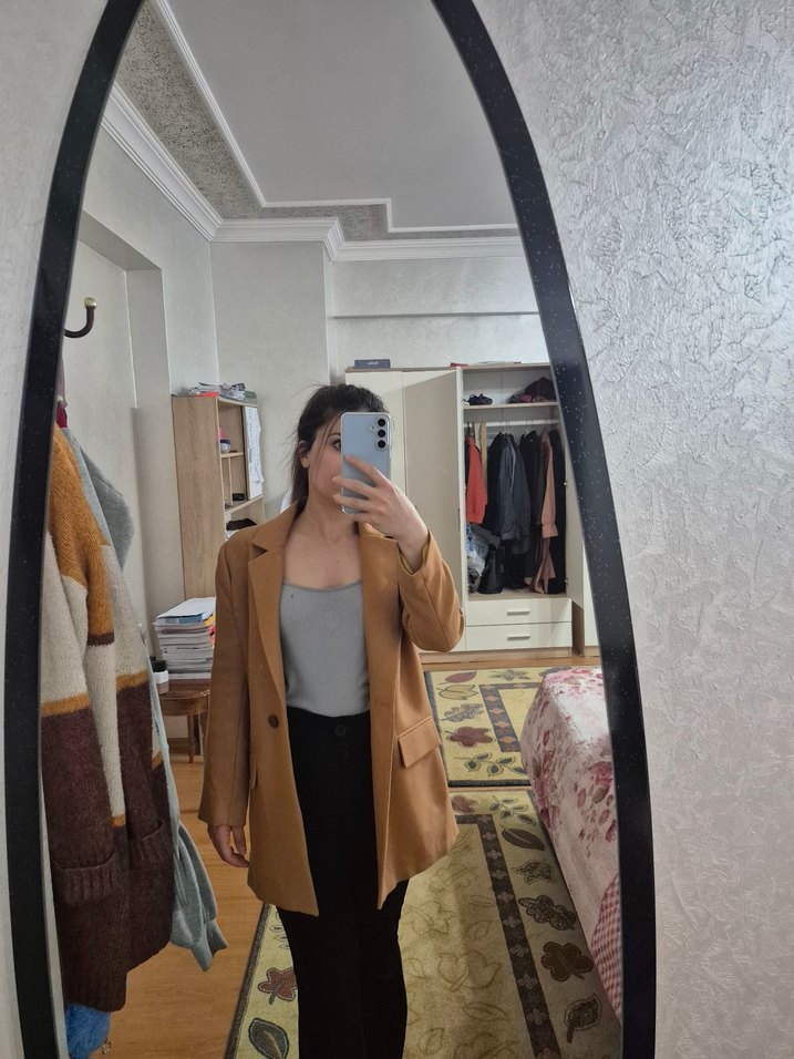 Uzun kollu, bej süet midi blazer ceket. Regular fit, kesik detayı ve klasik yaka ile ofis stiline uygun.