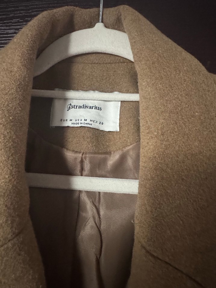 Bej renkli, süet kumaştan yapılmış, düğmeli ve kesimli yakalı kadın midi kaban. Uzun kollu ve günlük sokak stili için uygun. Stradivarius markası.