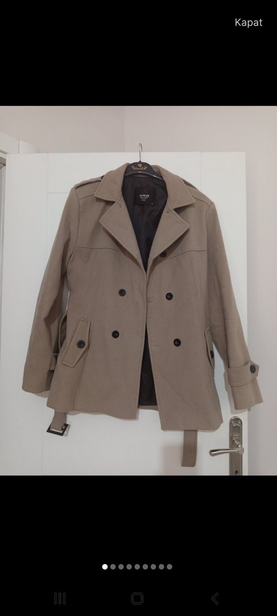 Bej renkli süet midi kaban, düğmeli ve kesik yakalıdır. Normal kesim ve askı detaylı kollara sahiptir, günlük sokak stili için uygundur.