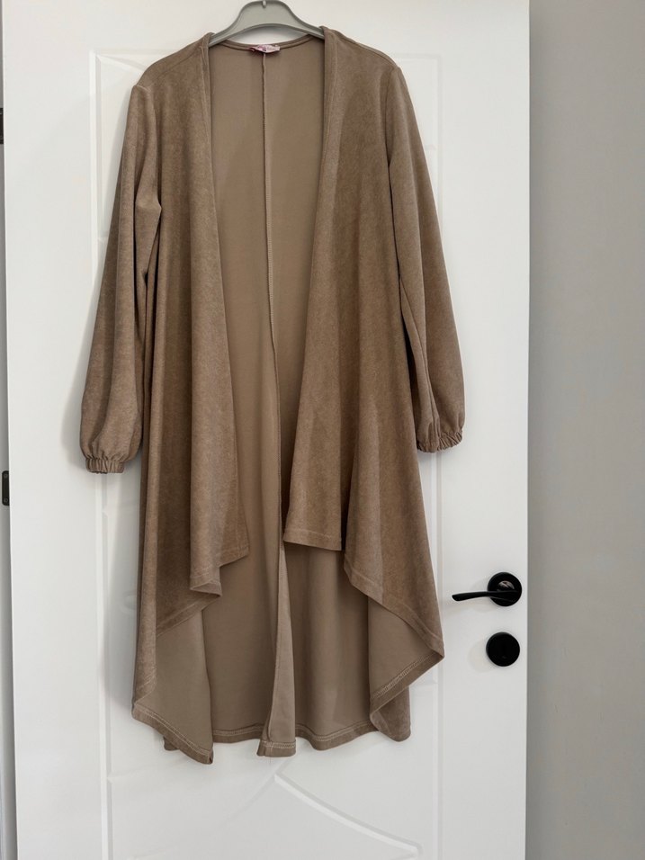 Bej renkli, süet dokulu, salaş kesim uzun ceket. Drapeli tasarımı ve yakasında çentikli detay bulunur. Günlük kullanıma uygundur.