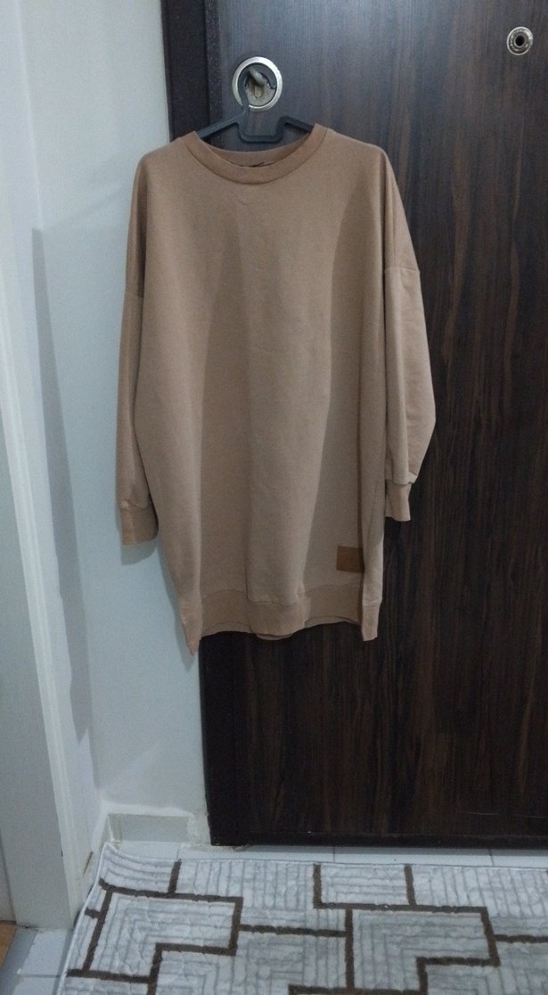 Bej renkte, uzun kollu ve yuvarlak yakalı süet sweatshirt. Rahat ve bol kesim, gündelik kullanım için uygun. 1 beden