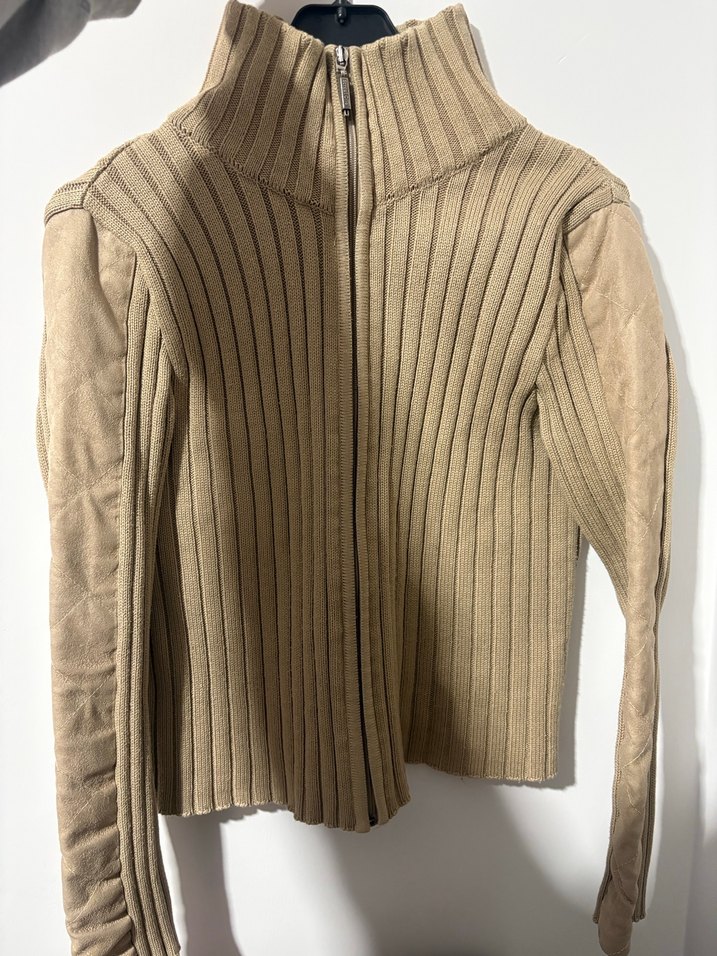 Bej renkli süet malzemeden yapılmış, yarım fermuarlı, uzun kollu ve ince örülmüş, rahat ve şık sokak stili hırkasıdır