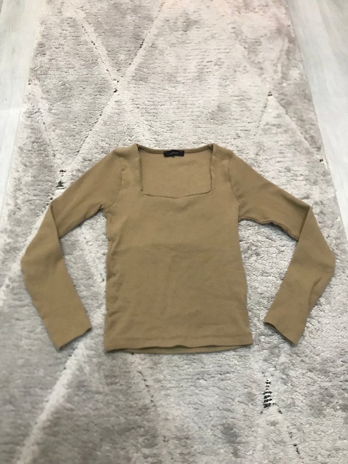 Bej renkte, süet kumaştan, uzun kollu ve tek renkli, rahat kesimli kadın bluzu. Günlük kullanıma uygun sade ve şık bir tasarım. Kare yaka uzun kollu bluz