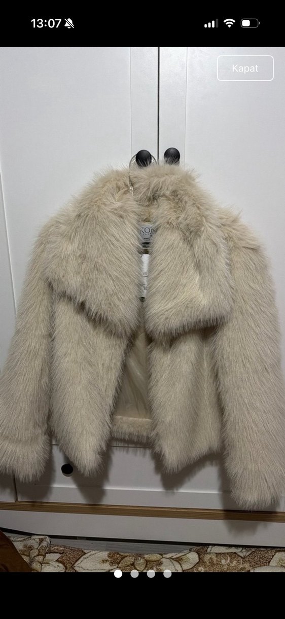 Yumuşak suni kumaştan yapılmış, bej renkli, uzun kollu ve kesik yakalı, klasik kesim kadın kürk ceketi. Günlük sokak stiline uygundur. markası temsili