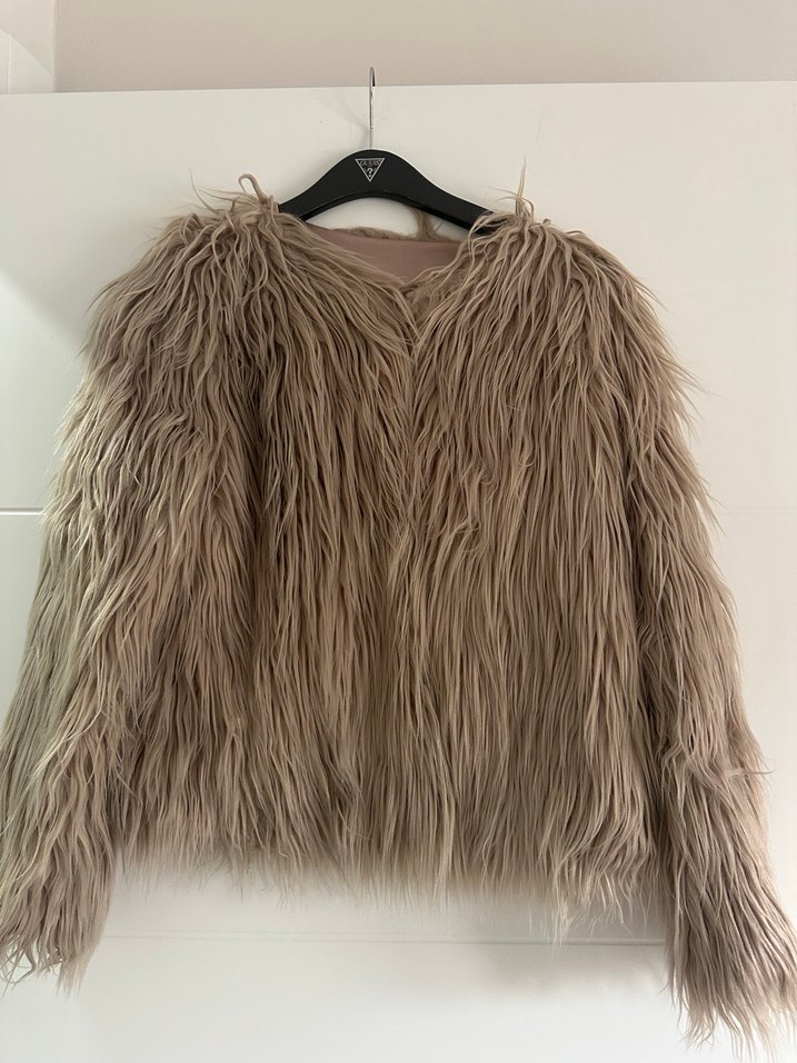 Bej renkli, uzun kollu ve bol kesim kadın suni kürk ceket. Notlu yaka ve desen içermeyen rahat tasarımıyla gündelik kullanım için uygundur.