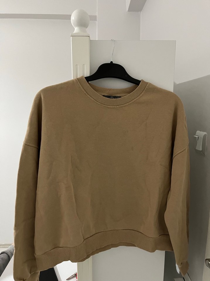 Bej renkli, yuvarlak yakalı ve uzun kollu kadın süet sweatshirt. Salaş kesimi ve normal boyuyla rahat bir sokak stili sunar.