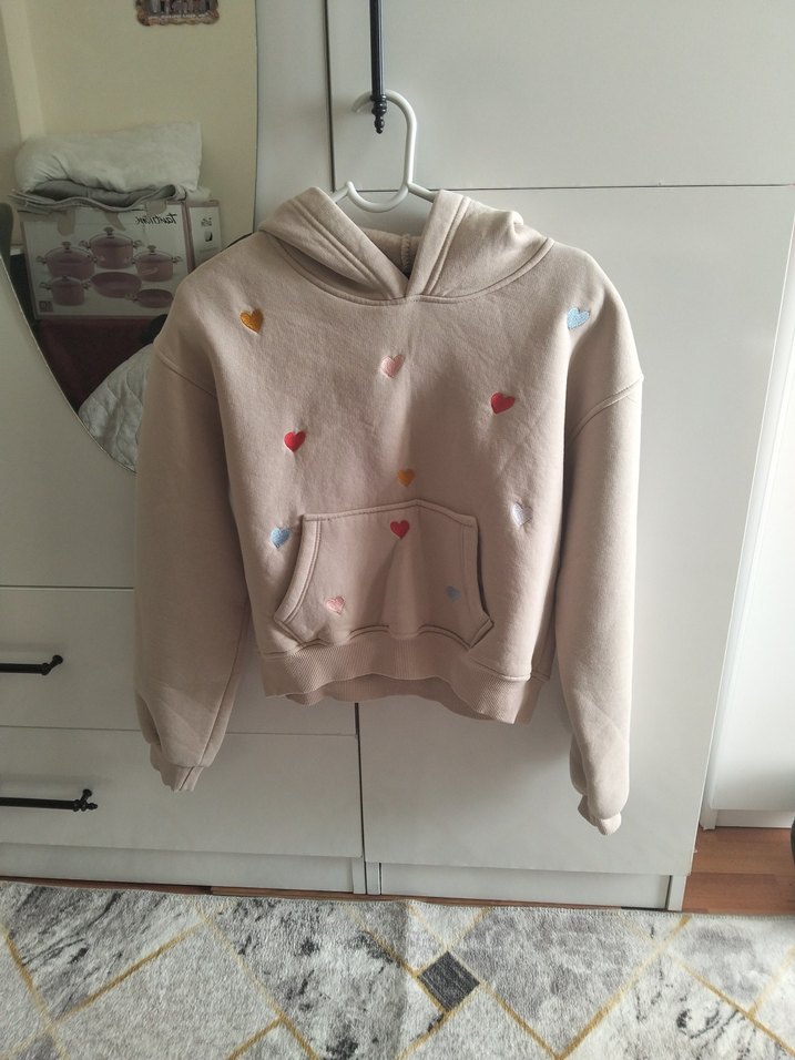 Nakışlı kalp desenli, kısa kesim bej sweatshirt. Uzun kolludur. Rahat sokak stili için uygundur.XL beden uyumludur