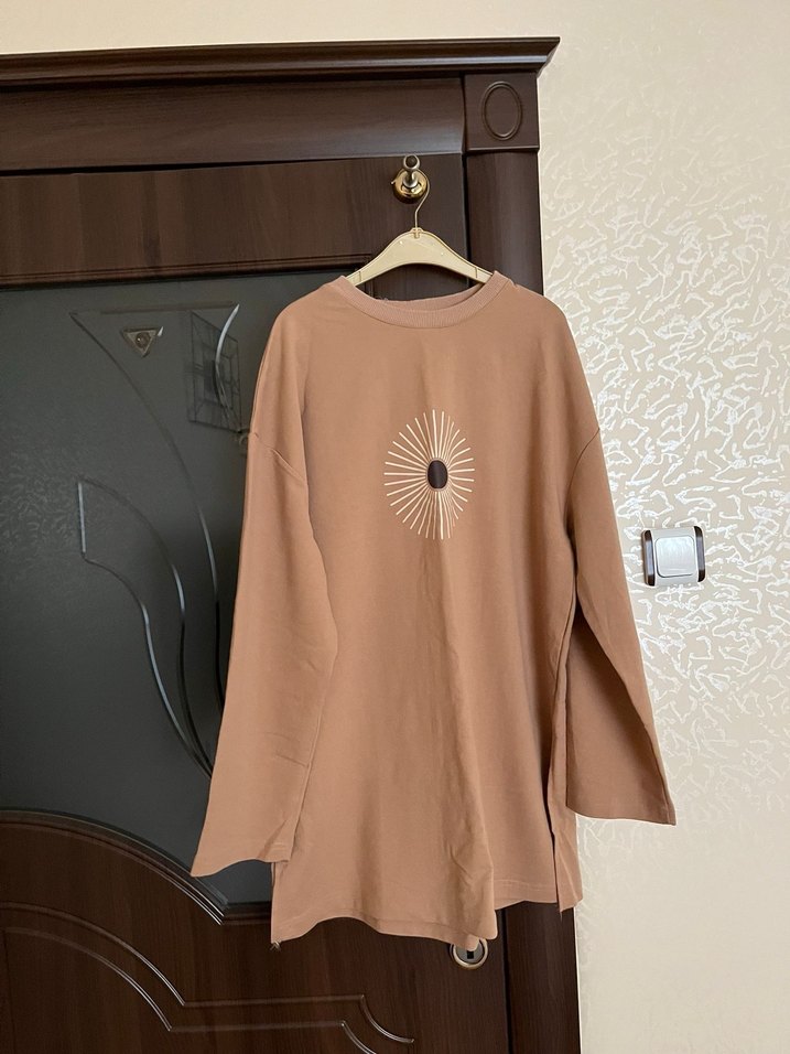 Düğmeli, baskılı detaylı, uzun kollu, bej renkli, rahat kesim kadın sweatshirtü. Yumuşak ve sıcak kumaştan üretilmiştir.