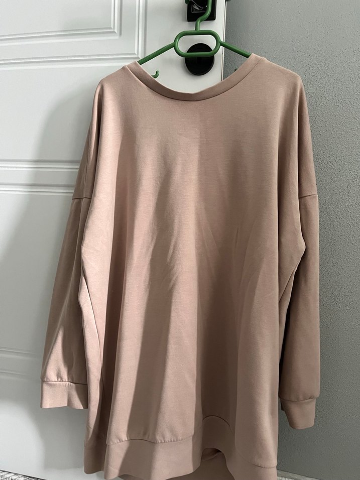 Bej renkte, yuvarlak yaka ve uzun kollu midi sweatshirt. Yumuşak keten kumaştan, bol kesim ve desen içermeyen minimalist bir tasarıma sahiptir.