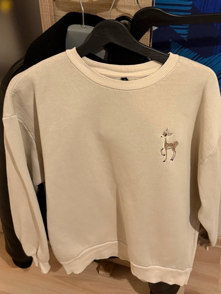 Bej renkli, yuvarlak yaka ve uzun kollu kadın sweatshirtü, rahat kesimdir. Küçük geyik baskısı ve yumuşak, sıcak kumaşıyla gündelik kullanıma uygundur.