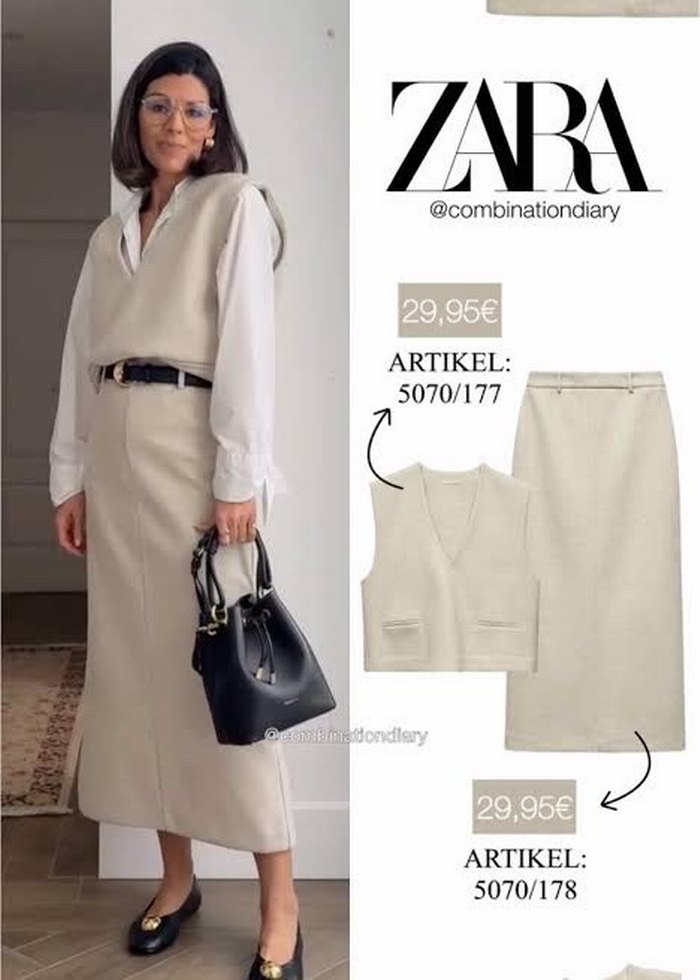Bej kumaştan, kolsuz V yakalı üst ve kısa etekten oluşan kadın takım elbisesi. Minimalist ve normcore tarzda, rahat kesimle şık bir görünüm sunar.