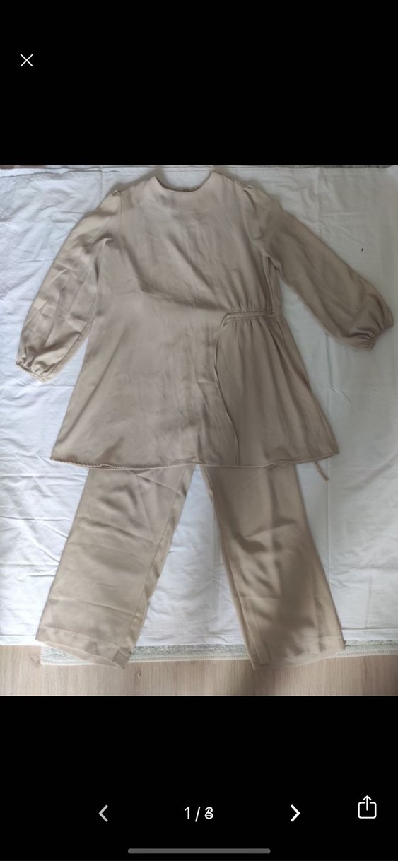 Bej , uzun kollu ve kesik yaka detaylı, günlük kullanıma uygun salaş kesim kadın takım elbise.