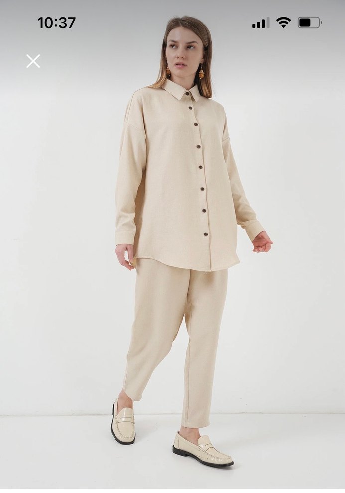 Etiketli hiç giyilmedi bej renkte, kumaştan kadın takımı, normal kesim ve midi boydadır. Notlu yaka ve uzun kollu, minimal ve desen içermeyen tasarımıyla günlük kullanıma uygundur. ⏰