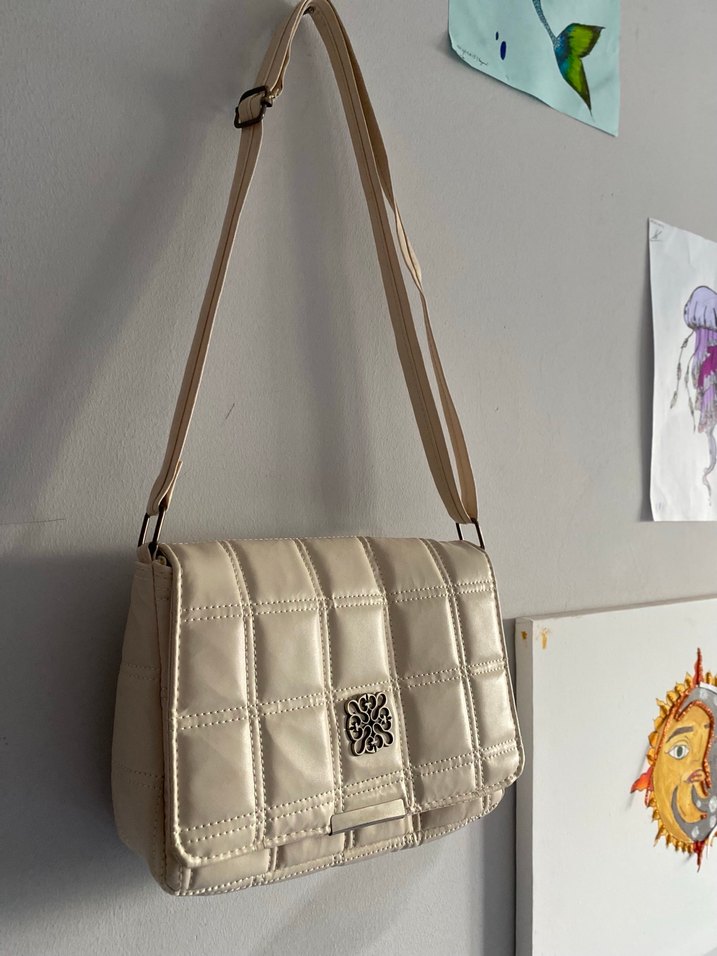 Bej renkte, tokalı kapaklı ve küçük logo detaylı sentetik kumaş kadın omuz çantası, gündelik şık sokak stiline uygun.