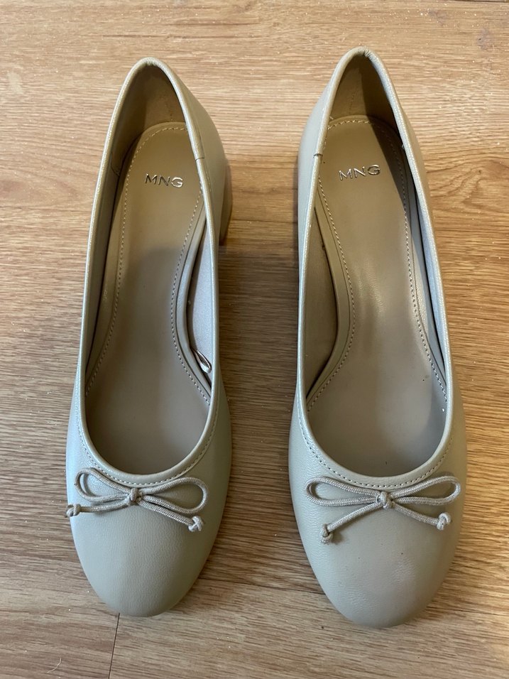 Bej renkte, topuklu ve fiyonk detaylı kadın babet ayakkabı. MNG markası, ofis kullanımı için uygundur.hiç giyilmedi