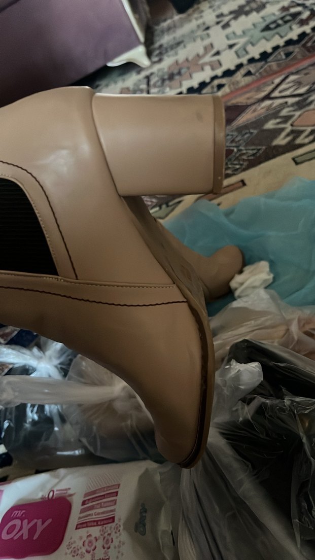 Bej renkte, Deri malzemeden yapılmış, tokalı ve kalın topuklu kadın botu. Günlük kullanıma uygun, çağdaş Paris tarzını yansıtıyor.