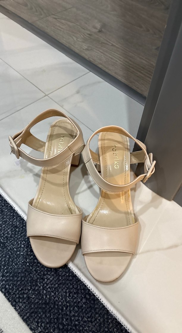 6cm Bej renkli, tokalı kayışlı kadın topuklu sandalet. Kauçuk malzemeden yapılmış, günlük kullanım için uygun, desensiz ve çağdaş tasarım.