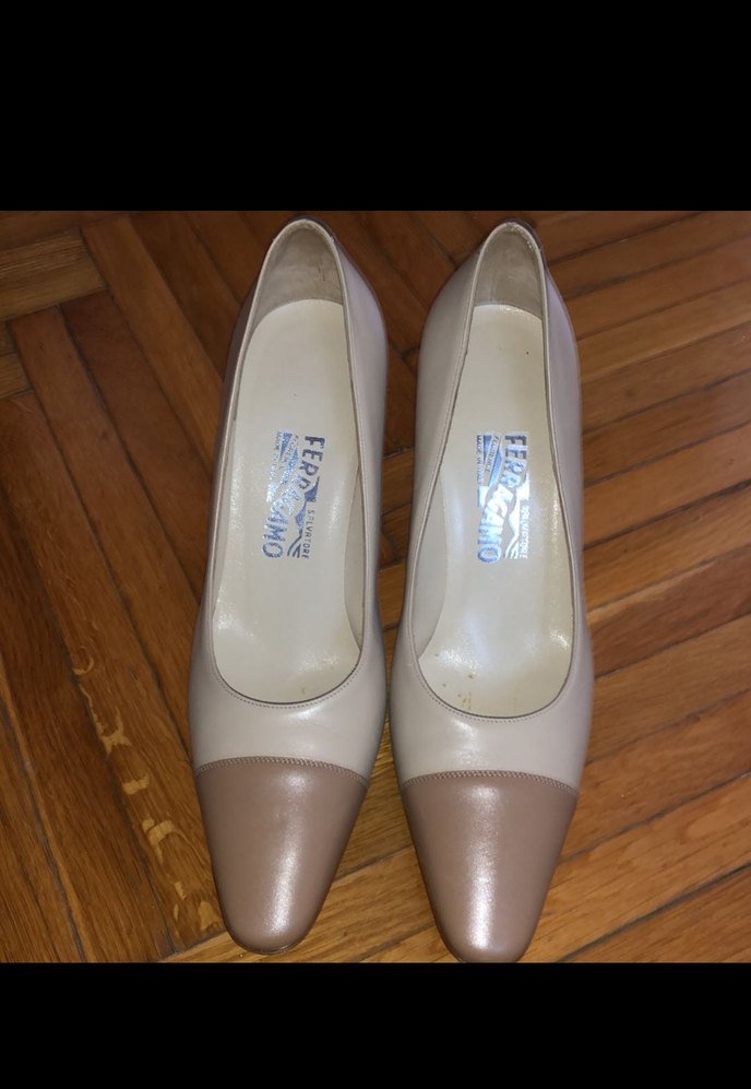 Bej renkte, topuklu kadın klasik ayakkabısı. Orjinal Salvatore Ferragamo
