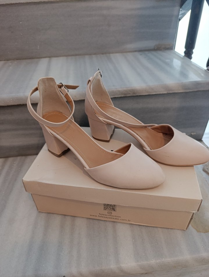 Bej renkli, topuklu ve bilekten bantlı kadın ayakkabısı, rahat kauçuk malzemeden üretilmiş. Ofis için modern klasik tarzda, zahmetsiz şıklık sunar.