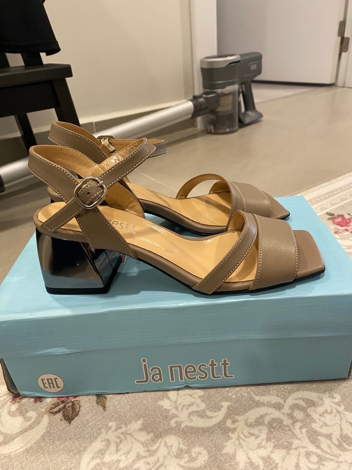 Bej renkte, tokalı ve blok topuklu kadın sandaletleri. Hakiki deriden yapılmış. Sadece 1 kere giyildi