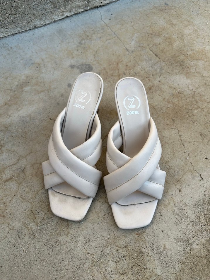 Bej, tokalı kayışlı kadın terlikler, blok topuklu ve minimal tasarımlıdır. Günlük kullanım için uygundur, desensiz ve çağdaş stil sunar.