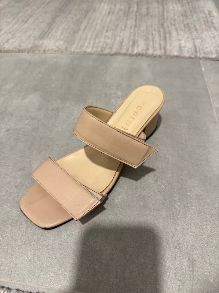 Blok topuklu, bej renkli kadın terlik. İki geniş bant ve tokası bulunur. Yumuşak kauçuk malzemeden, günlük kullanıma uygun minimal ve çağdaş tasarım.