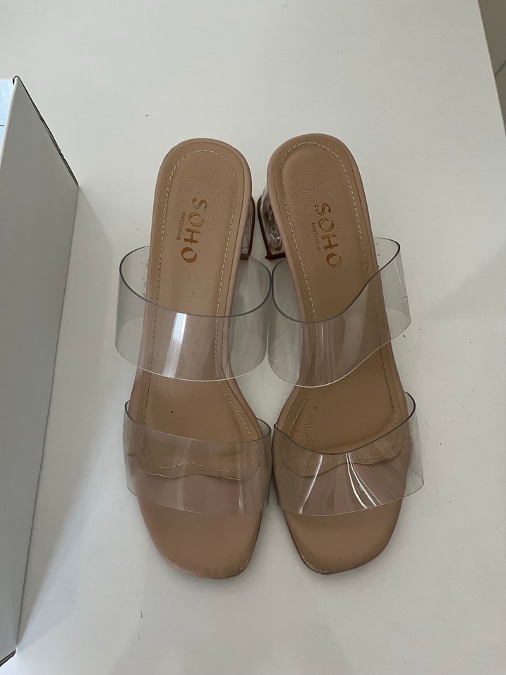 Bej renkte, şeffaf bantlı ve tokalı kadın terlikleri. Blok topuklu ve kauçuk tabanlı, minimalist ve çağdaş tasarım. Günlük kullanıma uygun, iç kısmında SOHO yazısı bulunur.