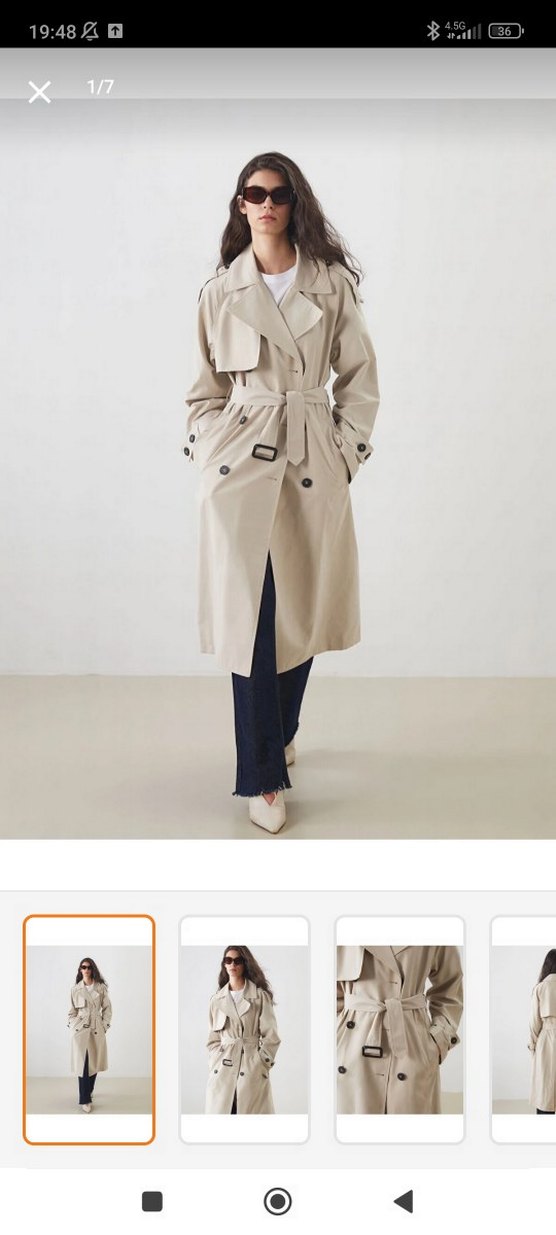 Bej renkli, kemerli trençkot. Notlu yaka ve uzun kollu, sentetik kumaştan üretilmiş, günlük kullanıma uygun, rahat kesim ve desensiz tasarım.