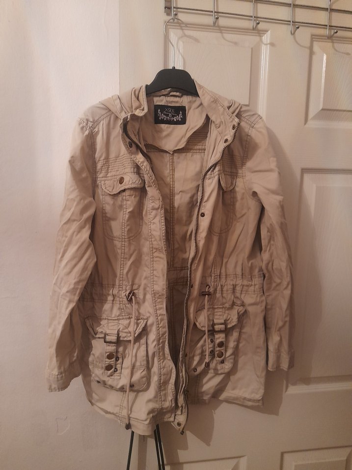 Bej renkli, keten kumaştan üretilmiş, cepli midi uzunlukta bol kesim kadın ceket. Notlu yaka ve uzun kolludur.