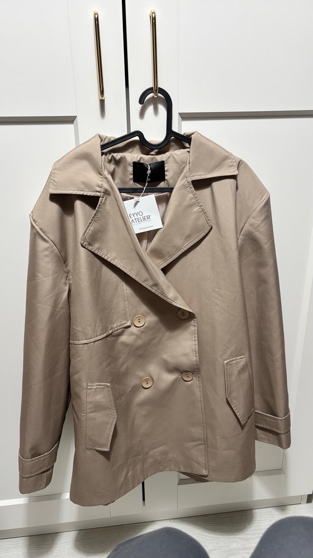 Bej, düğmeli, notched lapel yakalı trençkot. Uzun kollu, midi boy, günlük rahat kullanım için uygundur. Hediye geldi üzerime olmadığı için satıyorum.