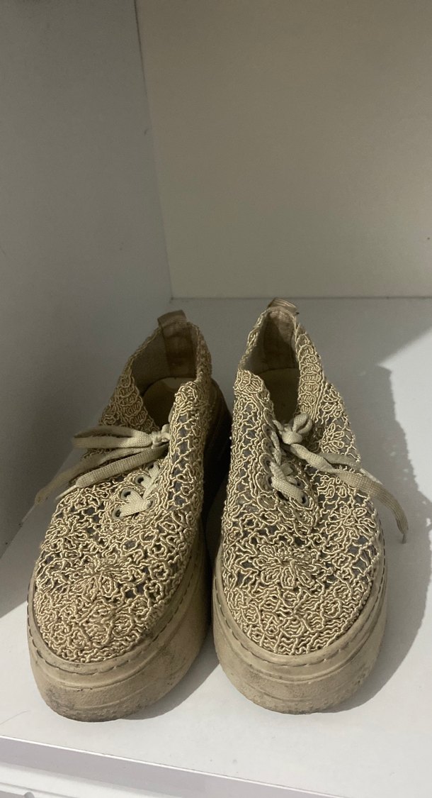Bej renkli kadın spor ayakkabılar, bağcıklı ve dolgu topuklu olup triko malzemeden yapılmıştır. Minimalist bohem tarzı için uygundur.