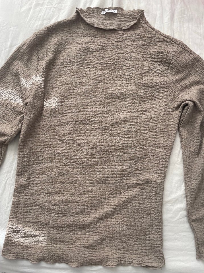 Bej renkli, yumuşak keten kumaştan örülmüş, bol kesim, uzun kollu ve balıkçı yakalı sade, rahat kadın kazak.