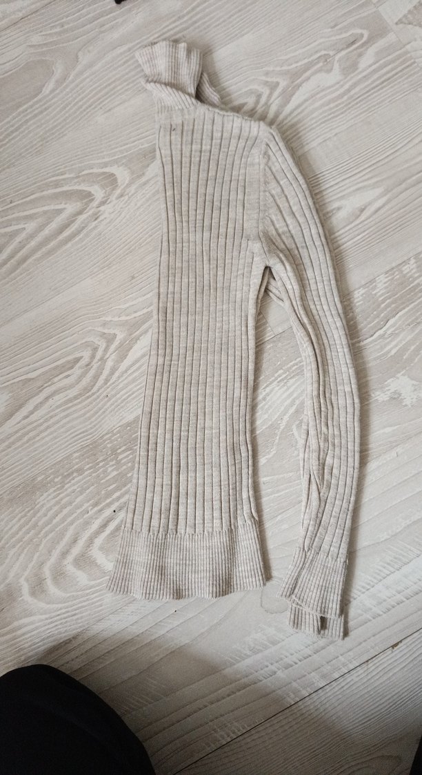Bej renkli, triko örgü, balıkçı yaka ve uzun kollu, ince keten kumaştan yapılmış, rahat günlük kullanıma uygun dar kesim kazak.