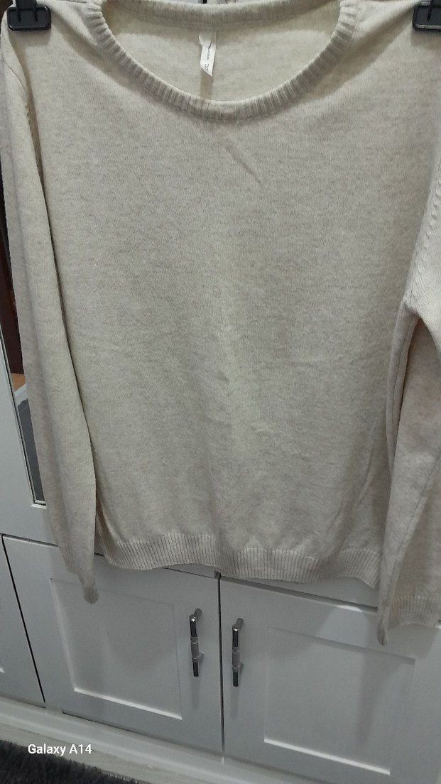 Bej renkte, bisiklet yaka ve uzun kollu kadın triko kazak. Yumuşak keten dokusu ve örme yapısıyla rahat ve sade bir stil sunar. Günlük kullanım için uygundur.