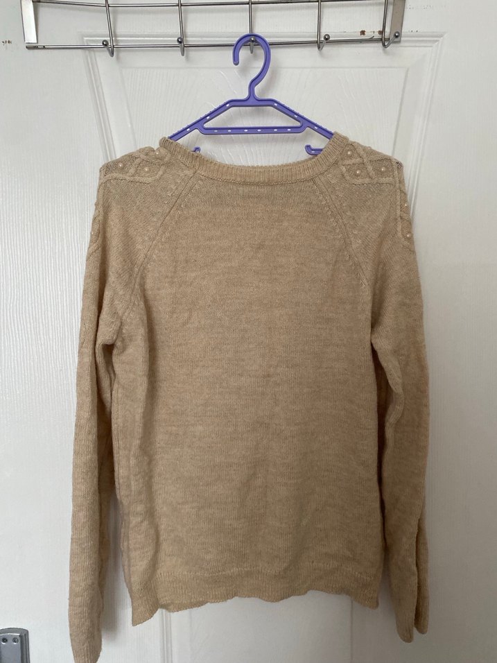 Bej renkli, bisiklet yaka, uzun kollu, triko kumaştan yapılmış rahat kesim ve normal boyda kadın kazak. Günlük kullanıma uygundur.