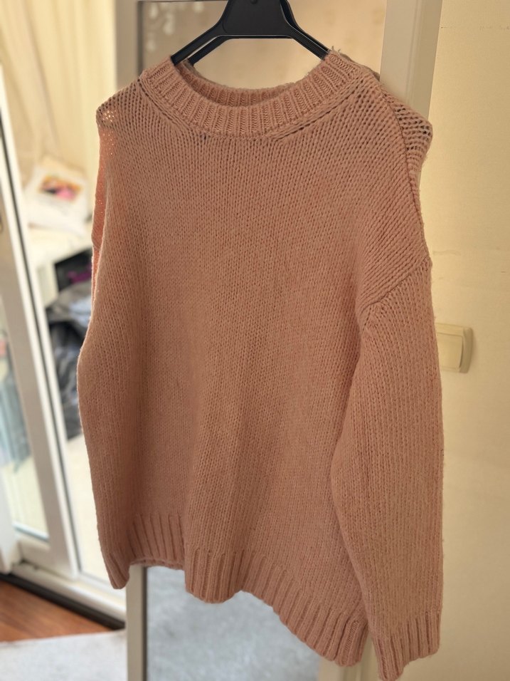 Bej renkli, triko örme, bisiklet yaka ve uzun kollu, salaş kesim kadın kazak. Düz ve pastel tonlarda, günlük kullanıma uygun.