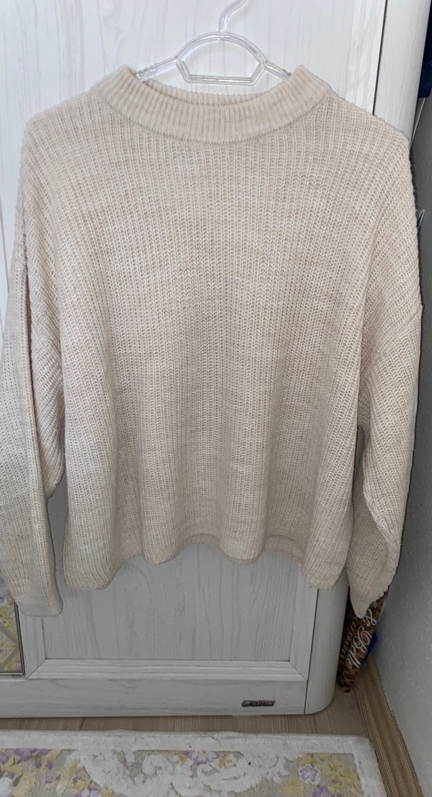Bej renkli, örme kumaştan yapılmış, bisiklet yaka ve uzun kollu bu kazak, rahat kesimiyle günlük kullanıma uygundur.