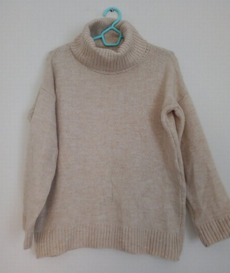 Bej renkli, boğazlı ve uzun kollu triko kazak. Rahat kesimi ve midi boyuyla günlük kullanıma uygundur.