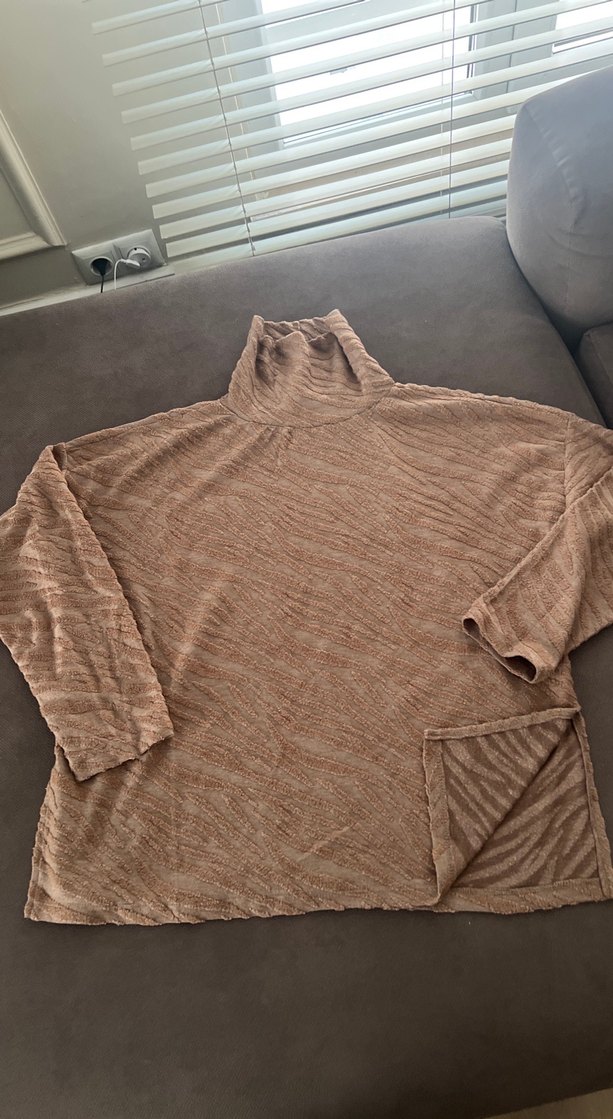 Bej renkli, triko örme, boğazlı ve uzun kollu, rahat kesim kadın kazağı, yumuşak keten kumaştan üretilmiştir.