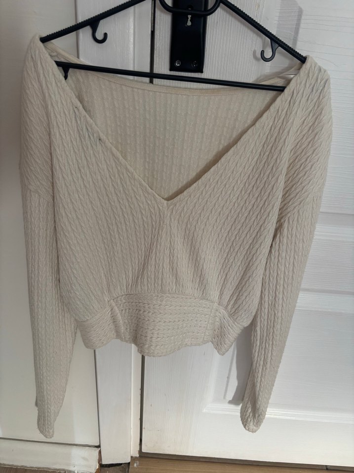 Bej renk, triko kumaştan yapılmış, uzun kollu ve kayık yaka, rahat ve şık bir günlük kullanım kazak. Orta uzunlukta ve desensiz tasarımıyla sokak stiline uygundur. Tam göbek hizasında bitiyor boyu ve çok dar değil kalıp olarak.
