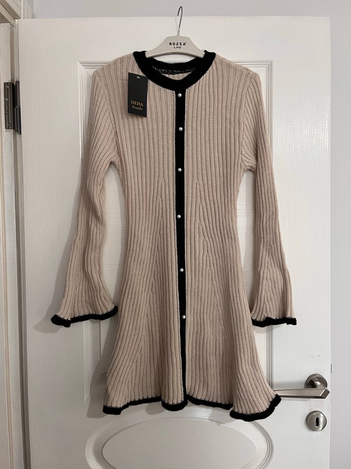 Bej renkli, uzun kollu ve bisiklet yaka, siyah detaylı triko elbise. Modern klasik tarzda, vücuda oturan kesimiyle günlük kullanıma uygundur.