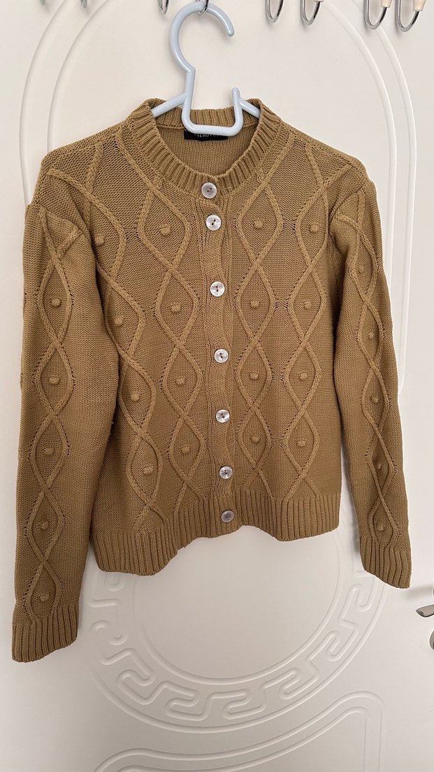 Bej renkli, triko dokulu kadın hırka. Bisiklet yaka ve uzun kollu, düğmeli, normal kesim. Günlük kullanıma uygundur.