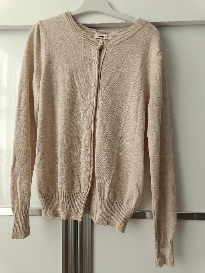 Bej renkte, uzun kollu ve yuvarlak yaka, keten kumaştan örülmüş rahat kesim triko hırka. Günlük kullanım için uygundur.