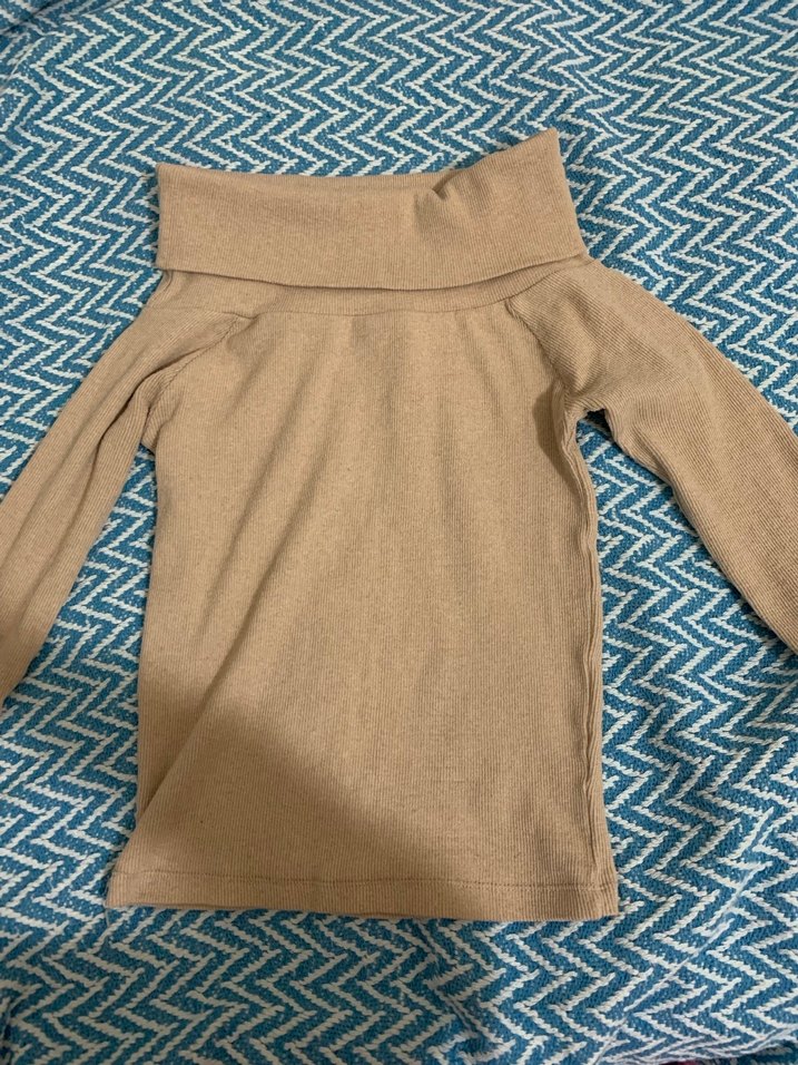 Bej renkli, kayık yaka ve uzun kollu, vücuda oturan kadın kazak. Yumuşak sentetik kumaştan örülmüş, günlük kullanım için rahat mevsimliktir
